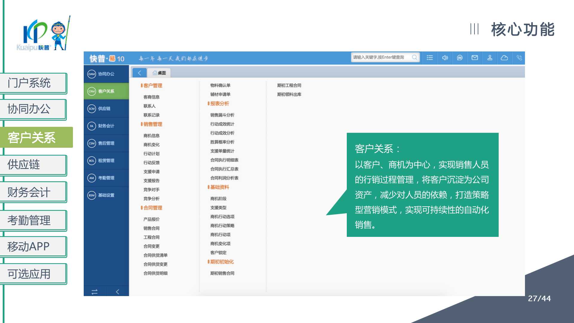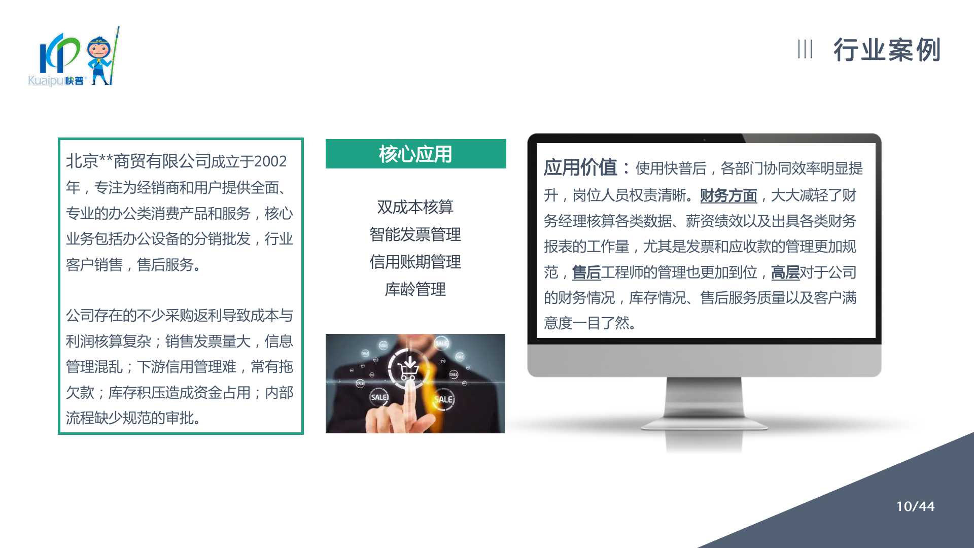 快普易10(商貿(mào)版)提供以客戶為中心的數(shù)字化管理解決方案,涵蓋客戶、銷售、庫存、資金、財務(wù)等業(yè)財一體化管理,全面優(yōu)化流程、提高企業(yè)效率,讓每一筆生意明明白白!