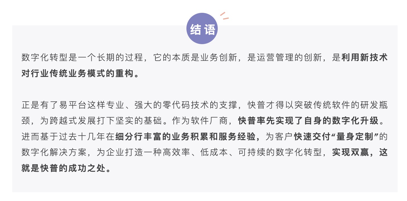 是的,我們可以很自信地說(shuō)“快普零代碼平臺(tái)讓數(shù)字化轉(zhuǎn)型變得簡(jiǎn)單、可行”。這個(gè)是面對(duì)數(shù)字化轉(zhuǎn)型的所有角色而言的,包括我們自身軟件研發(fā)、實(shí)施交付,以及合作伙伴、用戶等,易平臺(tái)在效率、成本、技術(shù)門(mén)檻和可擴(kuò)展性等方面來(lái)說(shuō)都有著顛覆性的突破,是非常有意義和必要的基礎(chǔ)設(shè)施。總結(jié)說(shuō)有下面幾點(diǎn):