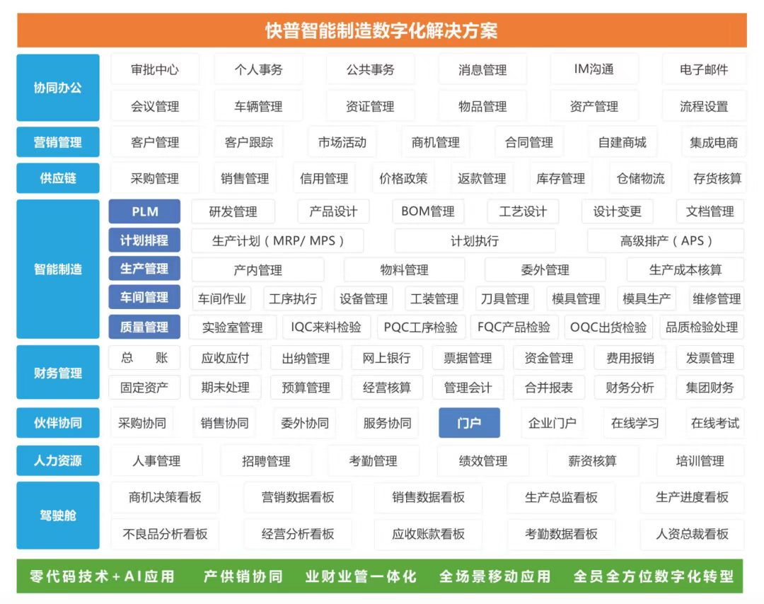 快普智能制造數(shù)字化解決方案整合了12大系統(tǒng),全面覆蓋華達(dá)環(huán)衛(wèi)的管理需求,為其提供協(xié)同辦公、客戶關(guān)系、供應(yīng)鏈、財(cái)務(wù)會(huì)計(jì)、智能制造(含研發(fā)PLM、MRP、APS、生產(chǎn)、車間、質(zhì)量等管理)、售后管理、伙伴平臺(tái)、租賃管理、人力資源等一站式管理。